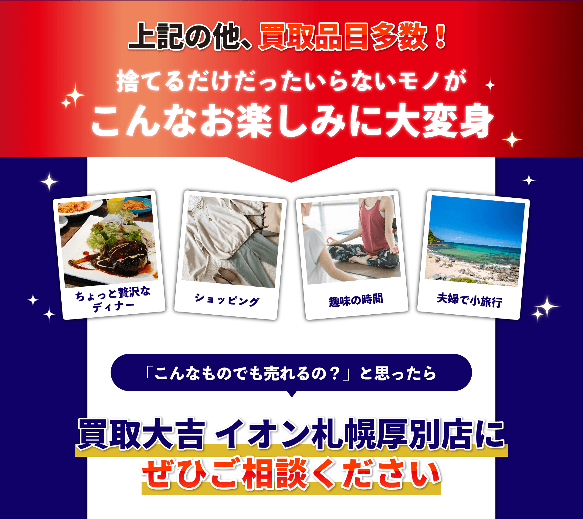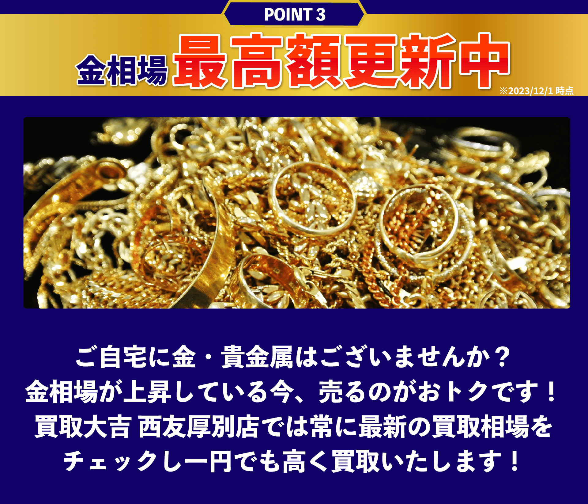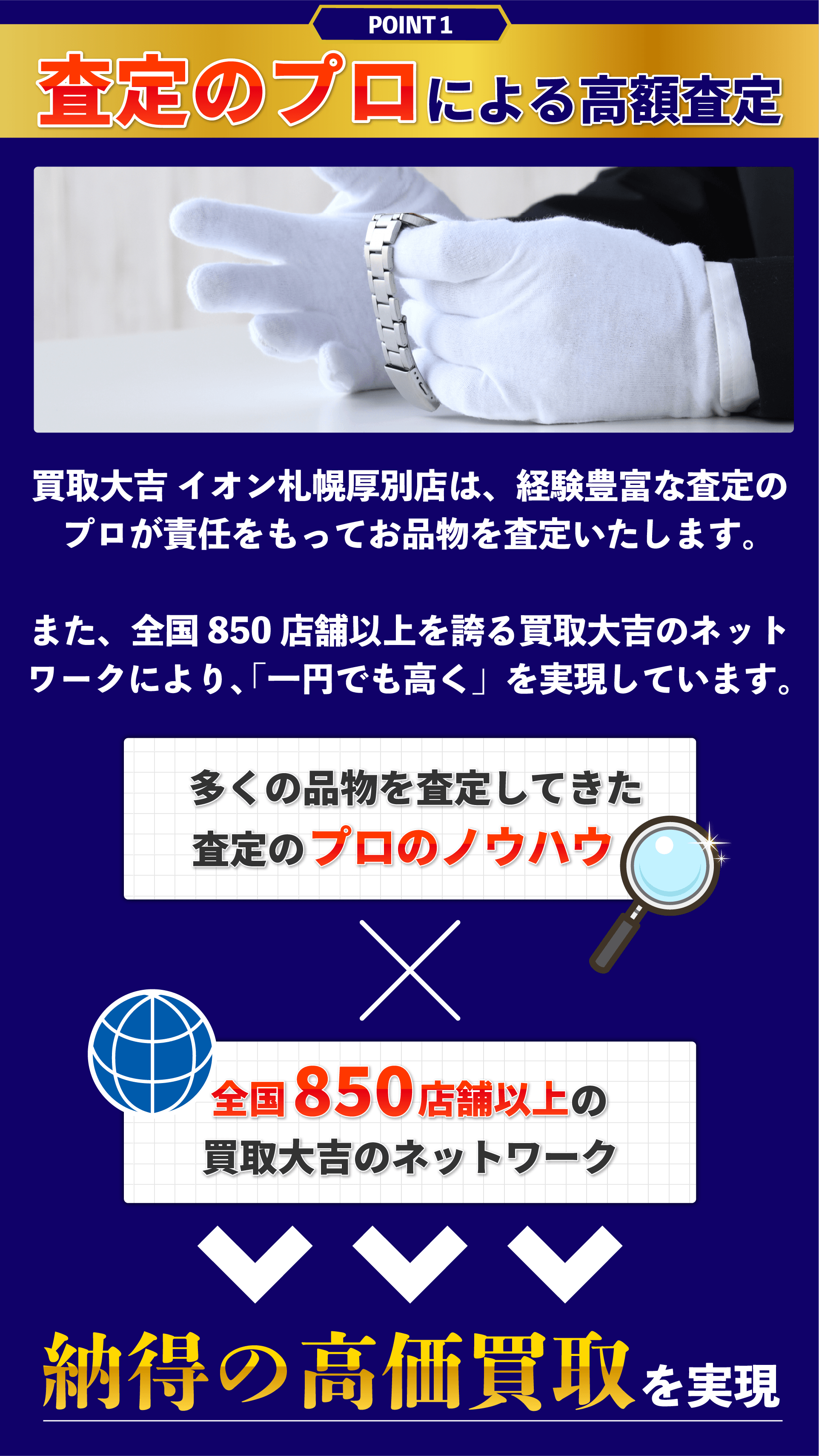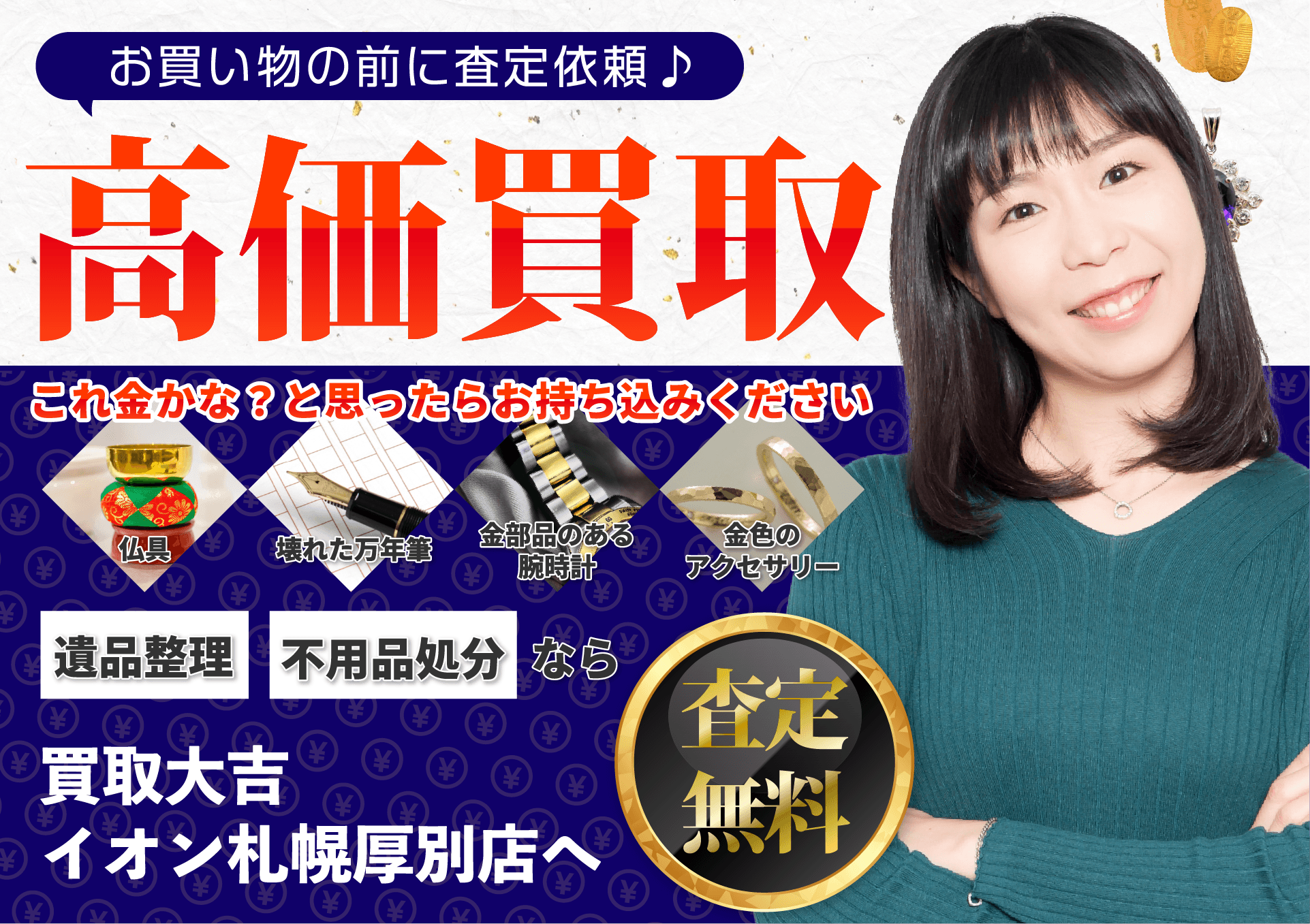 買取大吉イオン札幌厚別店 (以下「当社」)は、以下のとおり個人情報保護方針を定め、 個人情報保護の仕組みを構築し、全従業員に個人情報保護の重要性の認識と取組みを 徹底させることにより、個人情報の保護を推進致します。